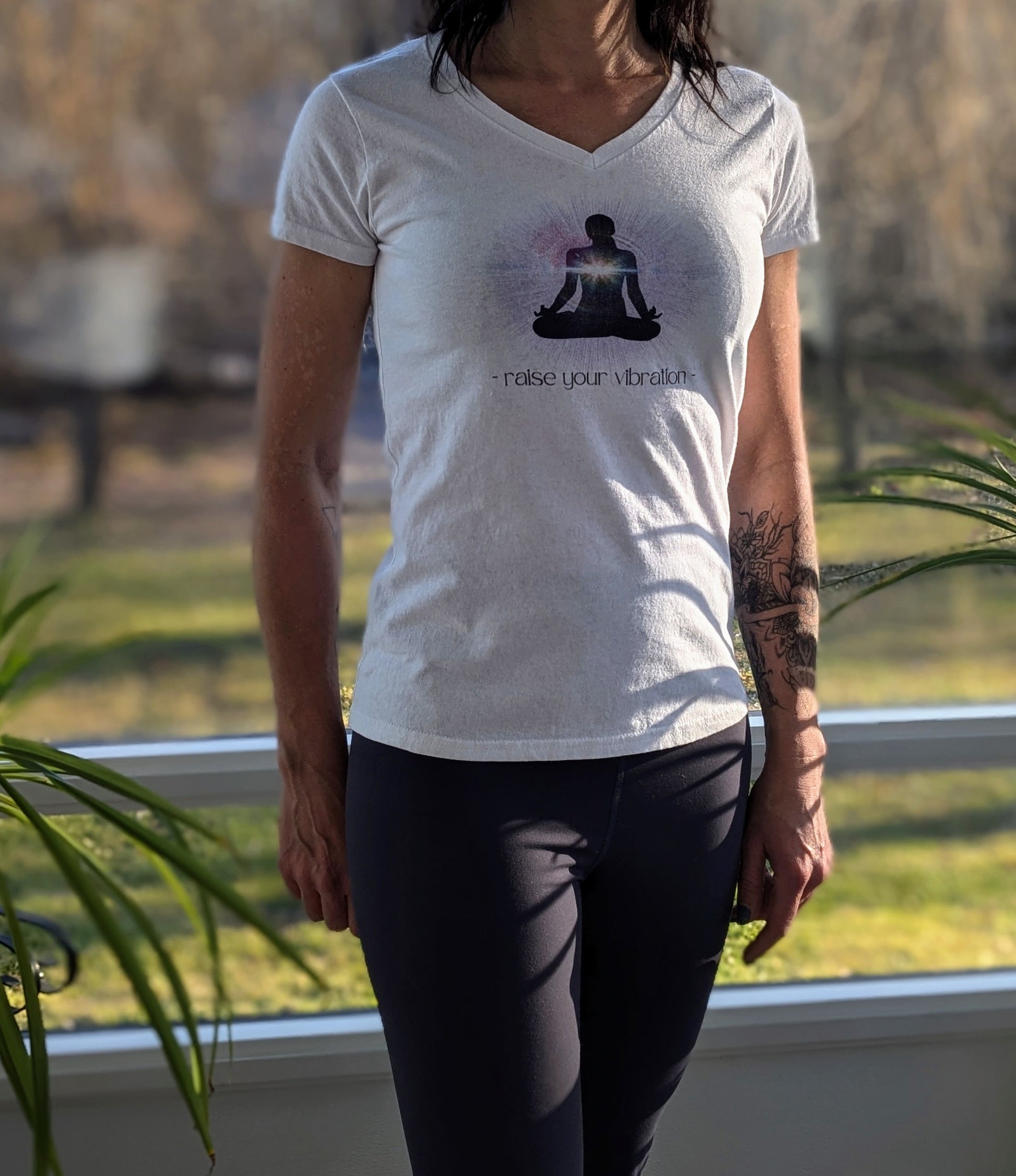 Pretty "raise your vibration" Women's White T-shirt V-neck, Spiritual, Yoga, Energy, Vibration, Frequency, Meditation, Yogini